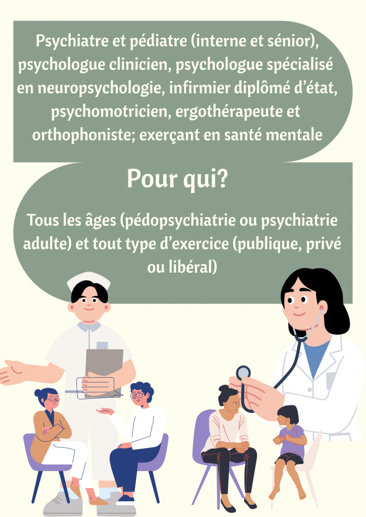 L’étude est ouverte aux orthophonistes avec une activité en santé mentale, que vous exerciez en pédopsychiatrie ou en psychiatrie adulte et quelque soit la modalité d’exercice. Elle est également ouverte auxprofessions suivantes : psychiatre (interne et sénior), psychologue clinicien, psychologue spécialisé en neuropsychologie, infirmier diplômé d’état, infirmier en pratique avancé, psychomotricien, ergothérapeute.