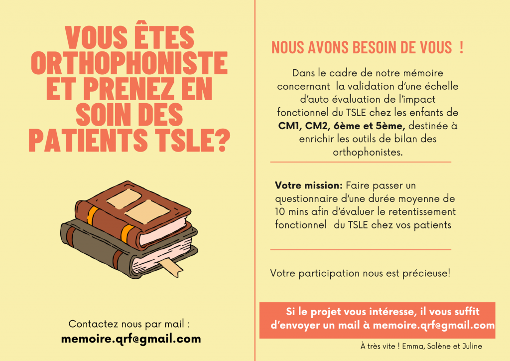 👉.png Mes collègues étudiantes et moi cherchons des orthophonistes prenant en soin des enfants avec un TSLE, scolarisés en CM1, CM2, 6e ou 5e, pour leur faire passer ce questionnaire (10–15 min de passation).